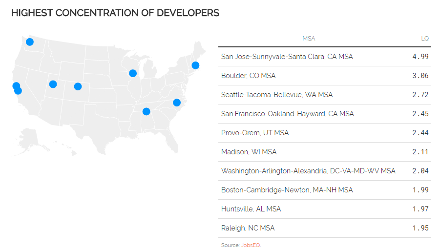 Most people would probably guess that the majority of developers work in some of our nation’s established technology hubs and/or largest metropolitan areas, such as Seattle, San Francisco, San Jose, Los Angeles, Dallas, New York, Chicago, or Atlanta. And, as shown in the table below, each of these metropolitan areas appears in the top ten list for employment of developers.
