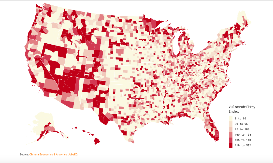This latter aspect is captured in our COVID-19 Economic Vulnerability Index. The index gauges the negative impact the COVID-19 crisis can have on jobs in a region based upon the industries present in the area and their expected job losses. Accommodation and food services, for example, are projected to lose more jobs as a result of the coronavirus compared to utilities and healthcare.