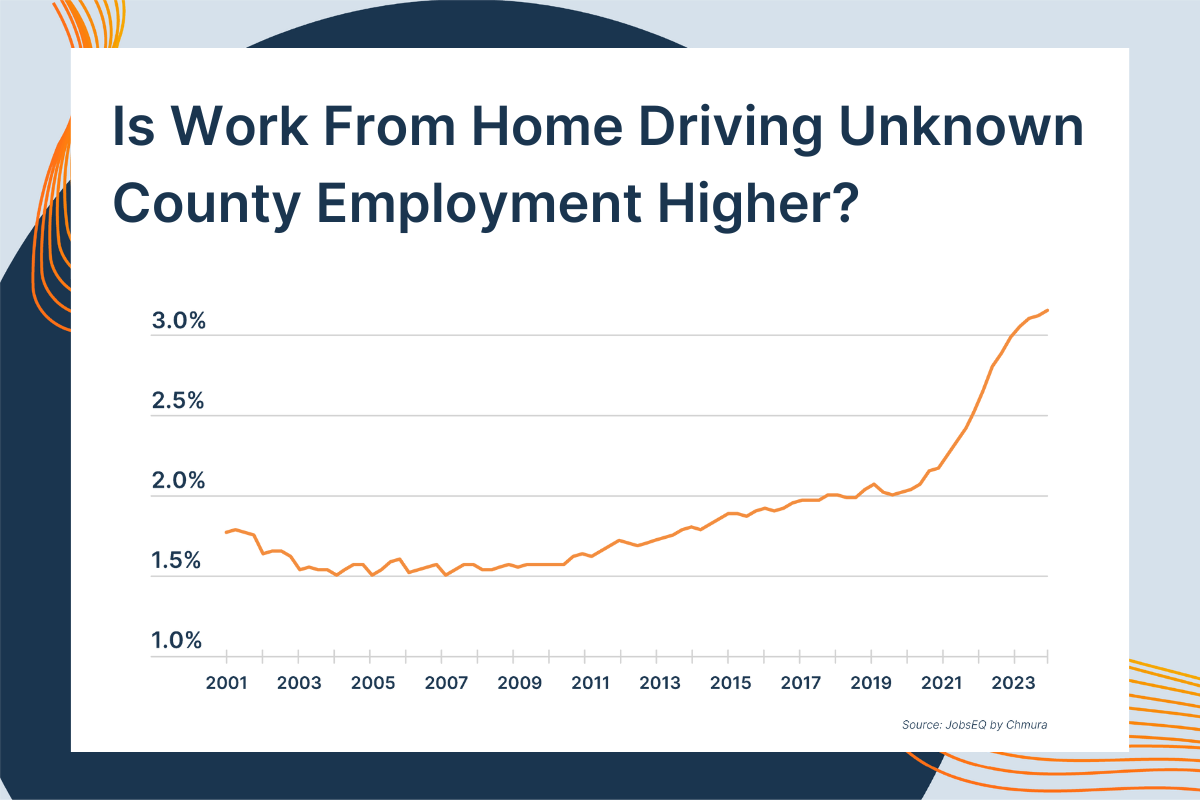 Data are not available that break out what percentage of employment in the unknown counties is due to which reporting scenario. Nevertheless, since the onset of COVID-19—corresponding with a rise in work-from-home practices for some employers—there has been a significant rise in unknown county employment.